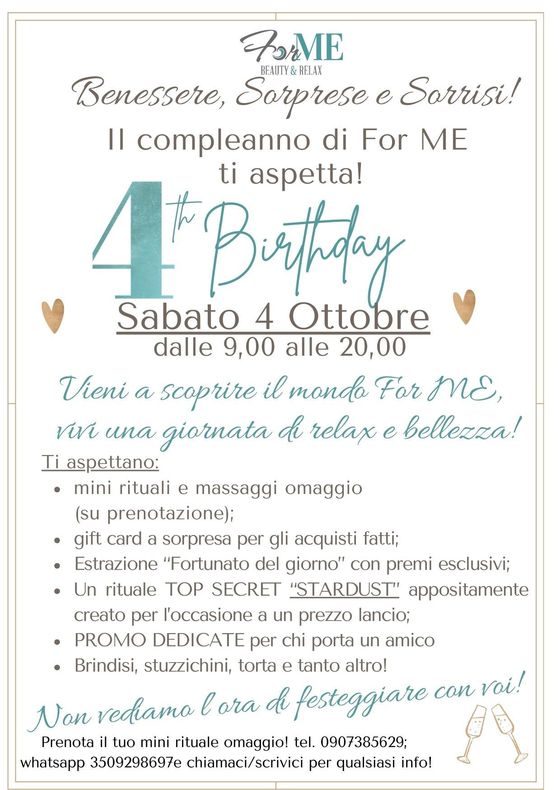 🎉 Sabato 4 ottobre → OPEN PARTY per tutti coloro che hanno voglia festeggiare e di provare il relax di For ME.