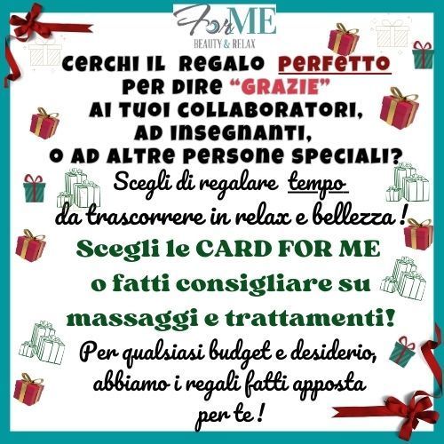 Scegli di regalare tempo da trascorrere in relax e bellezza ! Scegli le CARD FOR ME o fatti consigliare su massaggi e trattamenti! Per qualsiasi budget e desiderio, abbiamo i regali fatti apposta per te !